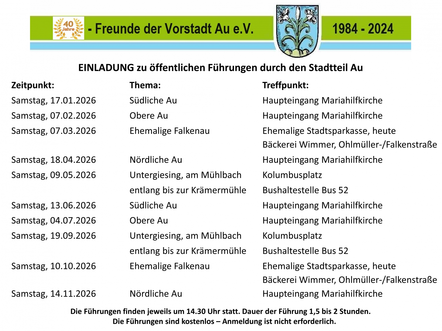 Wir laden Sie herzlich zu unseren öffentlichen Stadtteilführungen durch die Au ein